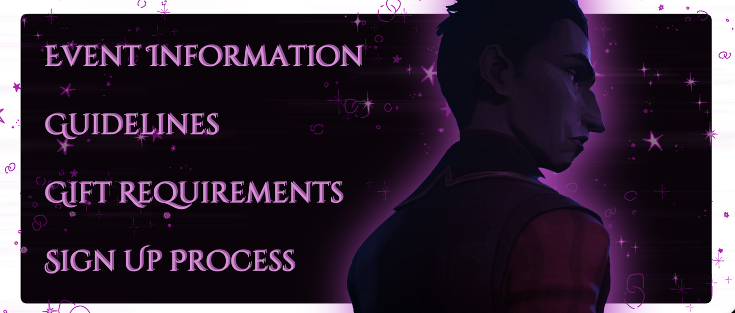Participants will fill out directly onto the AO3 collection, listing what they like and dislike as both the gifter (what you give) and giftee (what you receive).In this form, you will list your boundaries and interests for your gifter to avoid or include within their gift. You can optionally provide prompts to inspire your gifter, though it is not expected that they follow it to the letter.Once matching is complete, you will know who you’re making a gift for, but you will not know who is making a gift for you.It is crucial to not contact the person (or people) you are making gifts for. Remain anonymous until the creator reveals on October 31st.